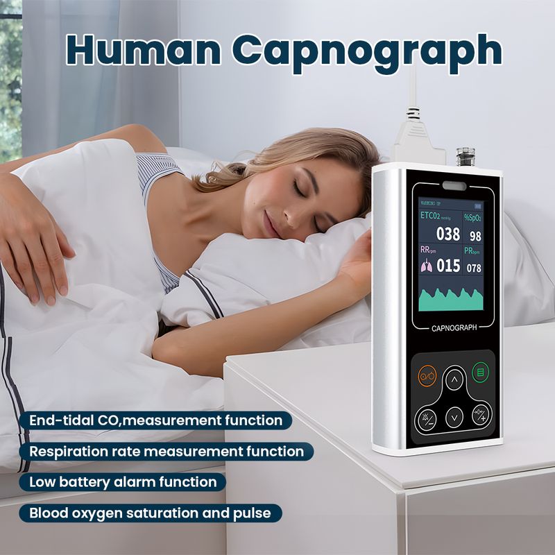 Capnograph adopts sidestream method to measure the end-tidal carbon dioxide, airway respiration rate and other parameters. It can detect pulmonary ventilation function and reflect the circulation and pulmonary blood flow as well as indirectly reflect the alveolar ventilation standard. Meanwhile, it can also detect the blood oxygen saturation and pulse.