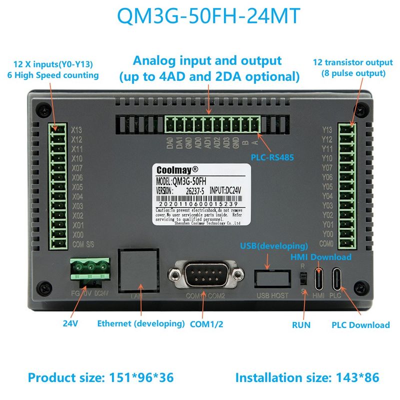 QM3G-50FH-24MR:5inch HMI PLC all in one,12DI 12DO, Relay output,Optional maximum 4 Analog inputs and 2 Analog outputs,1 RS232(HMI),1 RS232(PLC),1RS485(PLC).