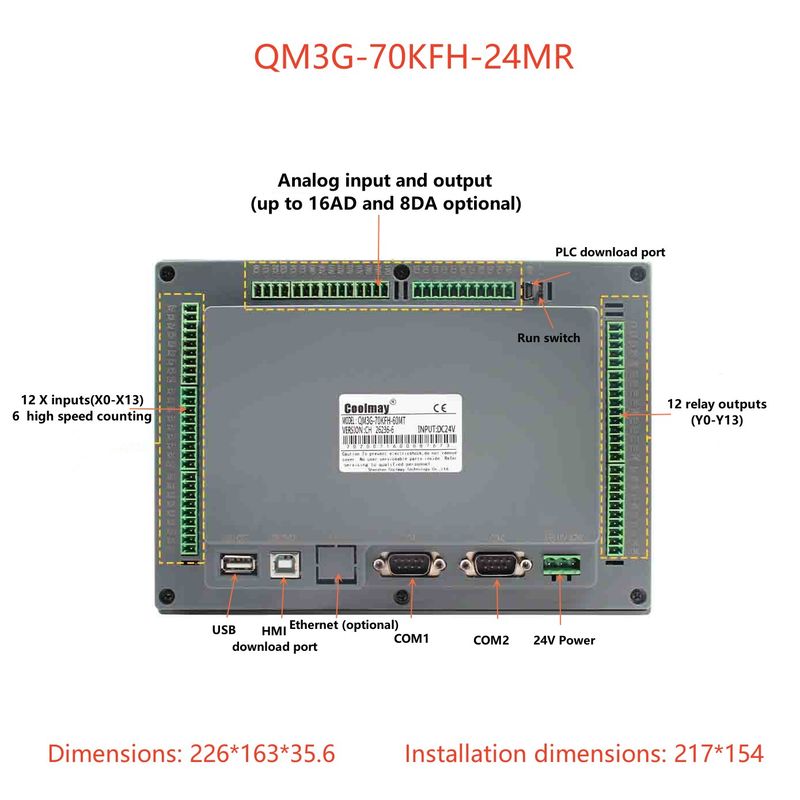 QM3G-70KFH-60MR:7inch HMI PLC all in one, 30DI 30DO,Optional maximum 5 Analog inputs and 2 Analog outputs, 1RS232(HMI), 1RS232(PLC),1RS485(PLC).