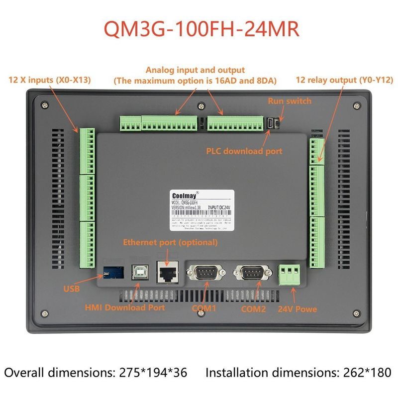 QM3G-100FH-24MR:10inch HMI PLC all in one, 12DI 12DO, Relay output,Optional maximum 16 Analog inputs and 8 Analog outputs,1RS232(HMI), 1RS232(PLC),1RS485(PLC).
