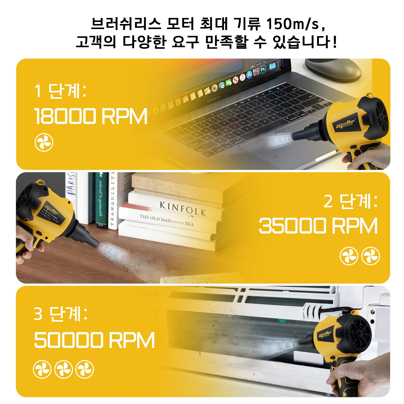 High-Powered Cleaning: The electric dust blower is equipped with a brushless motor that delivers up to 50000RPM speed, creating a maximum air thrust of 150m/s, effortlessly eliminate dust and debris from computer, desktops, window crevices, and more