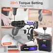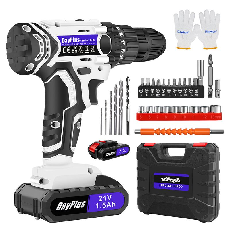 Cordless drill: the drill's rotation direction can be flexibly switched between clockwise and counterclockwise rotation; the carrying case is lightweight and sturdy, providing you with a portable experience and protection; high-quality LED light illuminates the darkness, making it easy to work even in the dark; ergonomically-designed handle provides a comfortable grip and reduces fatigue. The rear fixing strap effectively prevents the drill from slipping off while working.