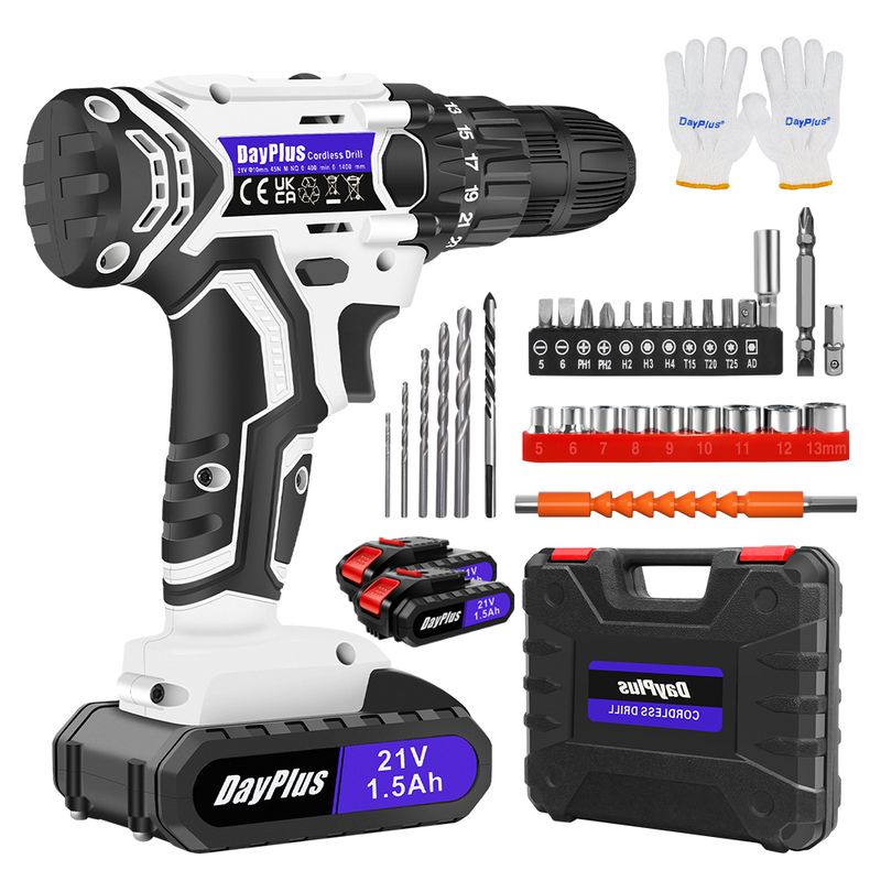 Cordless Drill Set, 21V Drill with 1.5Ah Battery, Cordless Screwdriver with Battery and Charger, Home DIY Tool Kit