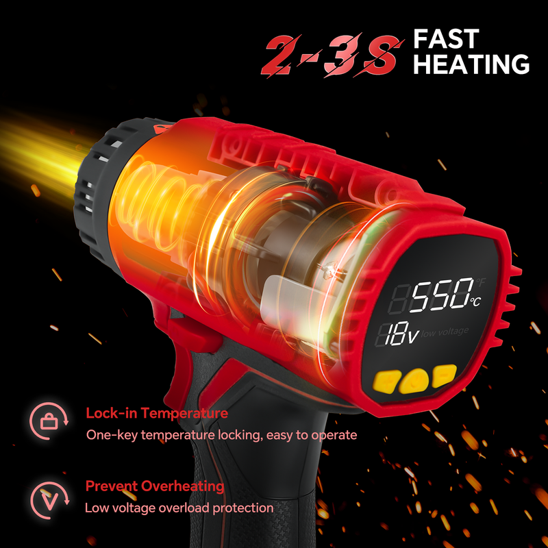 【Low Voltage Protection】---The overload protection feature will activate in case of abnormal voltage or temperature, causing the hot air gun to stop heating quickly to prevent damage to the device and circuit, ensuring long-term durability and safety.