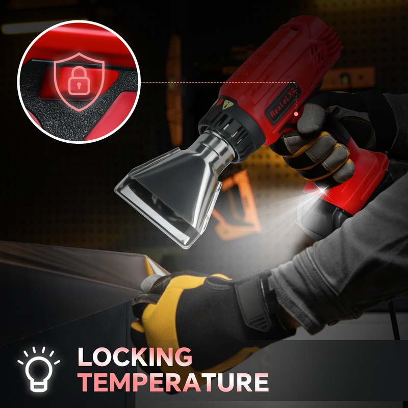 【Wide Applications with 4 Replaceable Nozzles】---This RexLeLXB heat gun is the first choice for professionals and DIY enthusiasts. In addition, we are giving away 4 nozzles for a variety of applications such as craft heat guns, shrink wrap, vinyl wrap, epoxy, candle making, wire connection, automotive packaging and more. With the proper nozzle attached to this portable battery heat gun, it can be used on a variety of surfaces and materials.