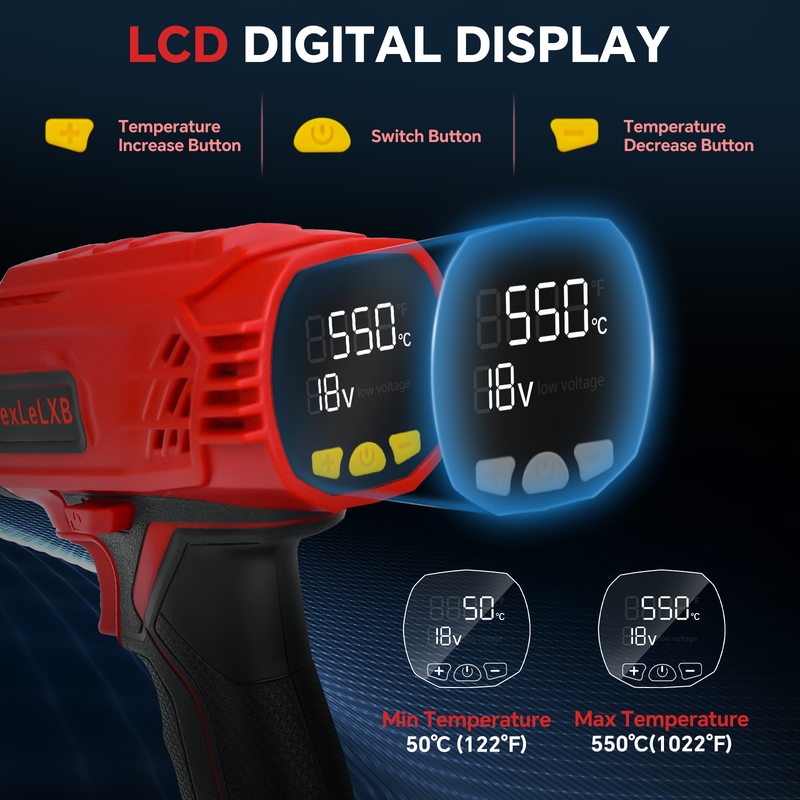 【Fast Heating & Adjustable Temperature】---The RexLeLXB heat gun is equipped with a high-definition digital LCD screen that can quickly heat up in 3 seconds, with a minimum temperature of 50 ° C (122°F) and a maximum temperature of 550 ° C (1022°F), so you can precisely adjust the temperature you want to improve your work efficiency.
