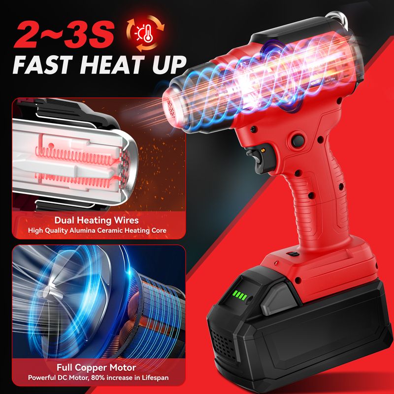 【Efficient Heating】——The cordless heat shrink gun for Milwaukee M18batteries is a highly efficient tool that quickly heats up to its maximum temperature in 2-3 seconds. Its powerful motor generates heat up to 1022 degrees Fahrenheit, making it ideal for a wide range of applications such as heat shrinking, paint stripping, and thawing frozen pipes.