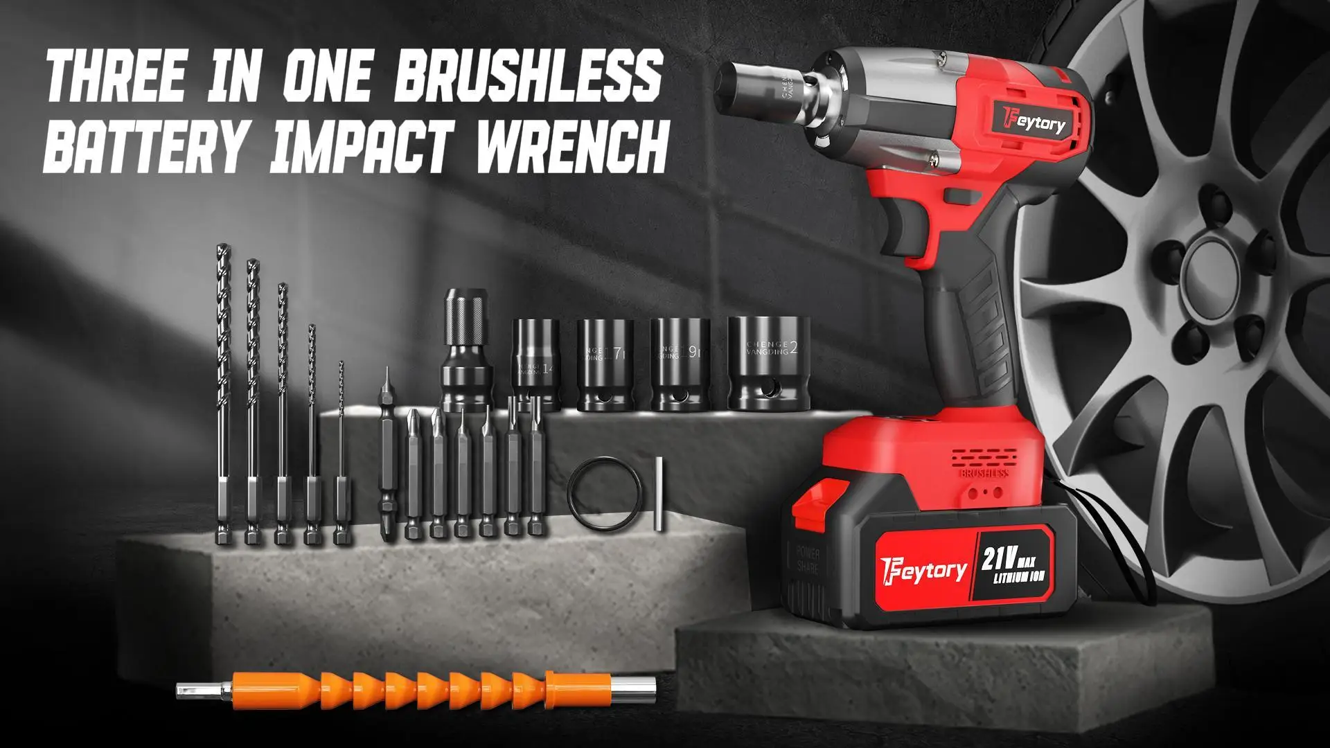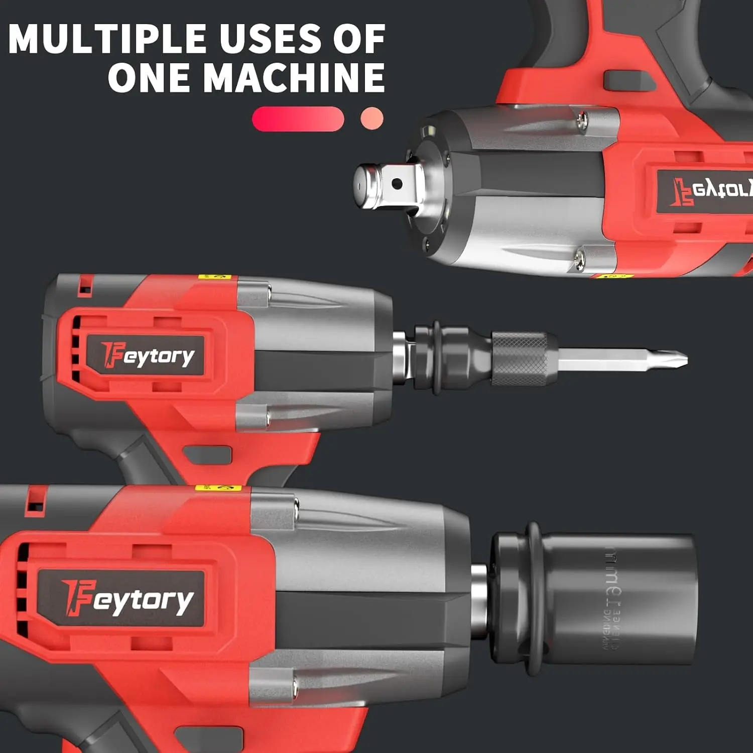 ใ3 in 1 Multifunctional Impact Wrench:ใ1.Cordless Impact Gun;2.Cordless Impact drill;3.Cordless Impact Screwdriver. Three Tools in One, In order to maximize the usage of this half inch Cordless Impact Wrench, this Electric Wrench Tool Set Offers Drill Adapter & Screw Adapter, so itโs also a multifunctional tool
