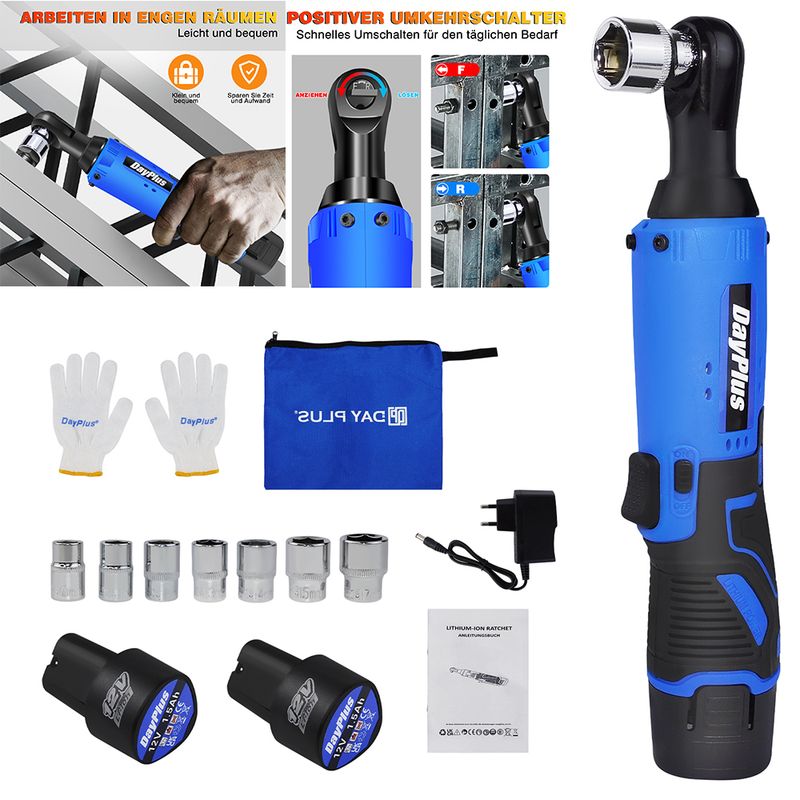 Package Contents: 1x cordless ratchet wrench, 2 x 1500mAh batteries, 1 x fast charger, 1 Pair of gloves, 1x Carry Bag, 7 sockets - 10mm, 11mm, 12mm, 13mm, 14mm, 15mm, 17mm.