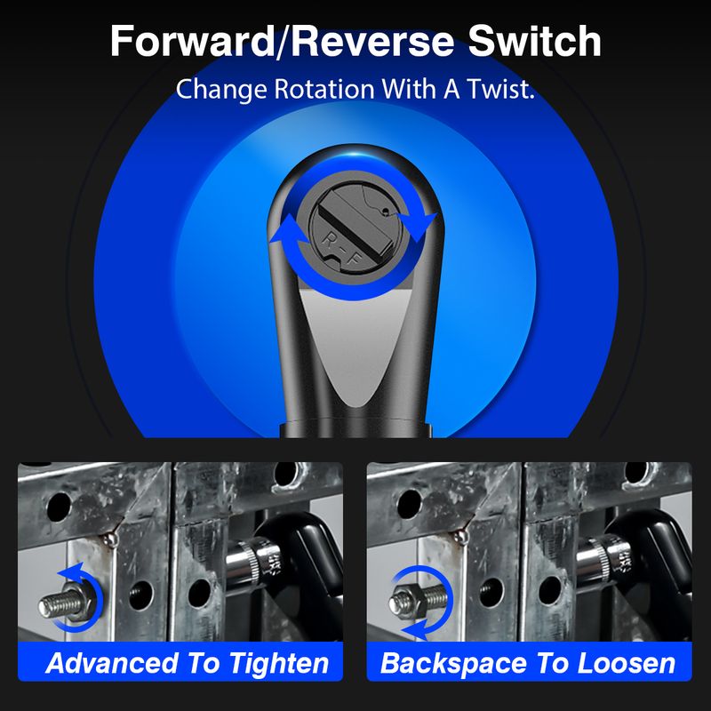 【Power Indicator & Built-in LED】Three Colored LED Lights Indicate Remaining Battery Level, Reminds you When You Have to Charge the Ratchet. Battery Ratchet Wrench Has built-in LED Work Light Also, Illuminates the Work Area While Working