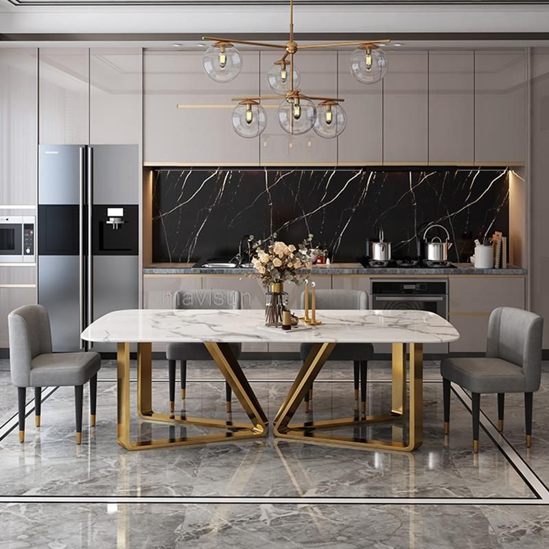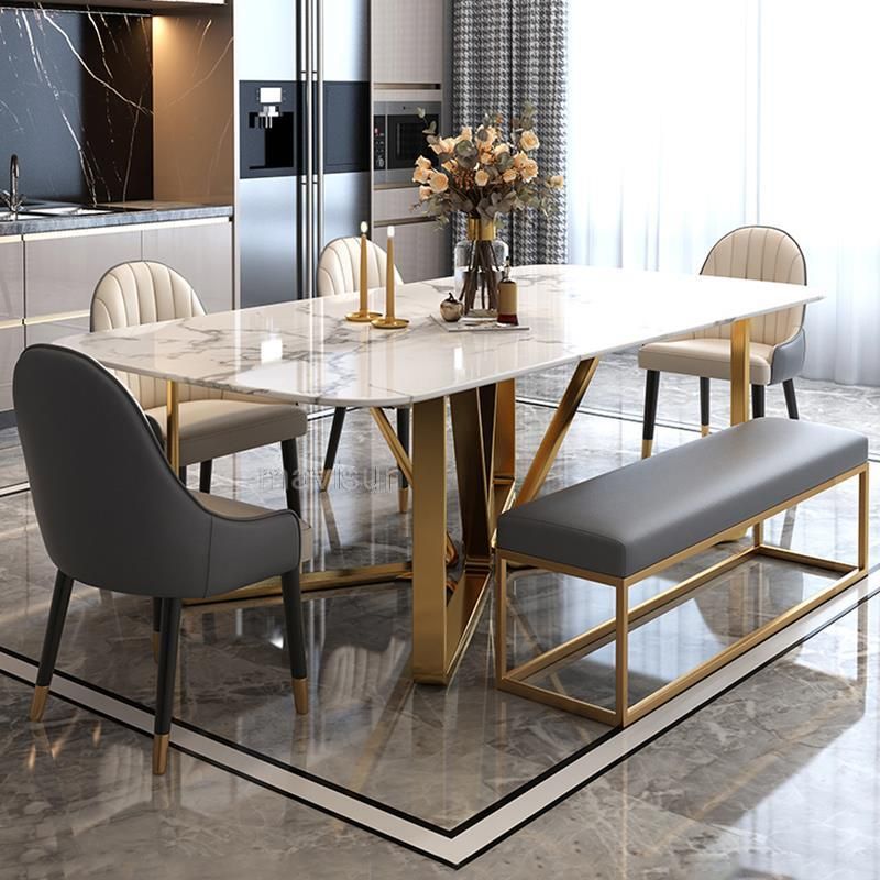 Light Luxury Marble Dining Table Minimalist Furniture Golden Stainless Steel Base Design High-End Rectangle Table And Six Chairs