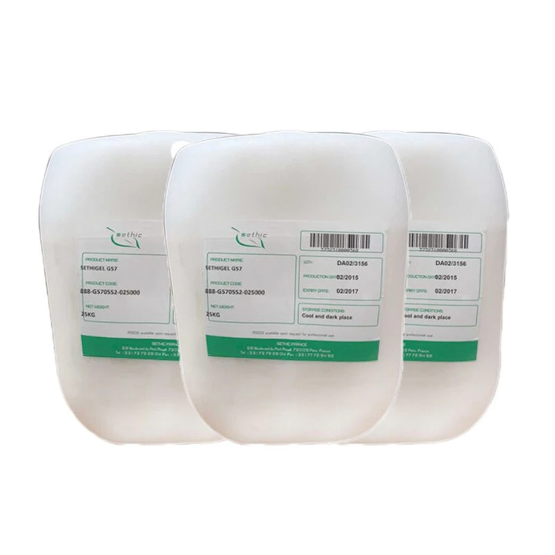 G57 is a proud cold formulated self thickening emulsifier from France's Xianting. It has unique advantages such as high activity content of 57%, high negative charge, ion resistance, acid and alkali resistance, low usage, good thickening and emulsification effect, and easy to use.