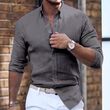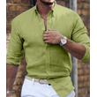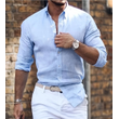 Cotton Linen Long Sleeve Shirt Solid Color Polo Collar Casual Style Shirt Blue M
