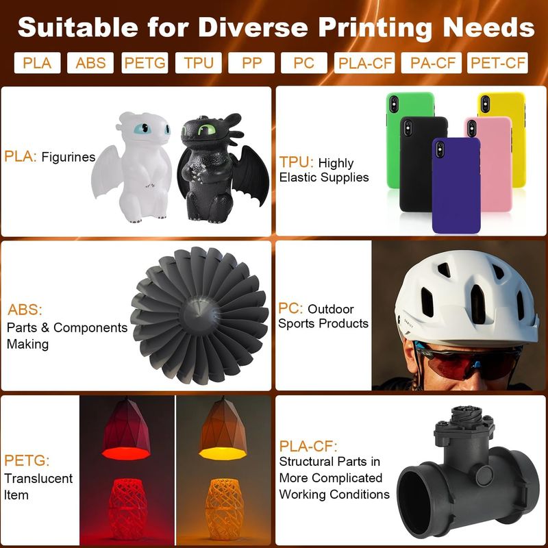 All Metal Design: All-metal design boasts enhanced performance and high temperature resistance up to 300°C which support PLA, ABS, PETG, TPU, PP, PC, PLA-CF, PA-CF, PET-CF multiple filaments printing.