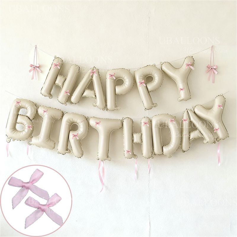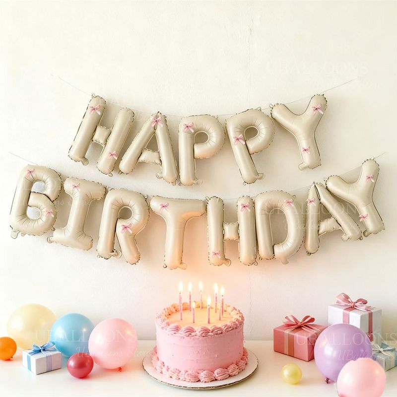 Cream Happy Birthday Balloons with Pink Bow 16Inch Beige Happy Birthday Letters Balloon Banner for Bow Coquette Birthday Decor
