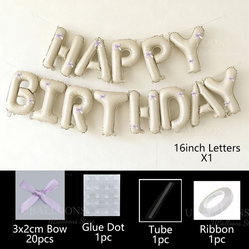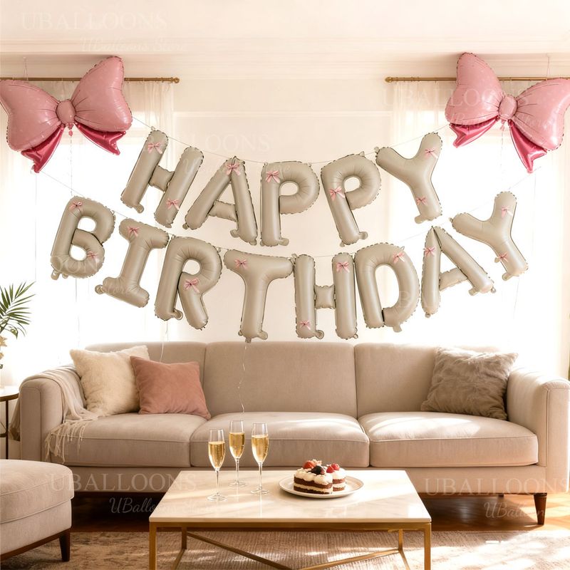 Cream Happy Birthday Balloons with Pink Bow 16Inch Beige Happy Birthday Letters Balloon Banner for Bow Coquette Birthday Decor