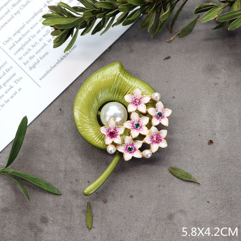 Creative Handmade Exquisite Green Plant Brooch Corsage Woman Retro Pearl Brooches Coat Accessories Jewelry