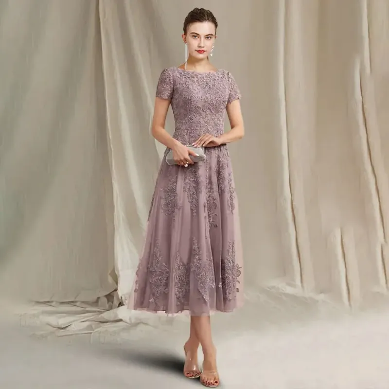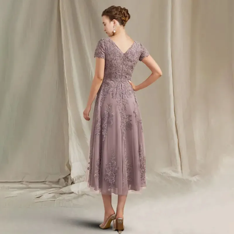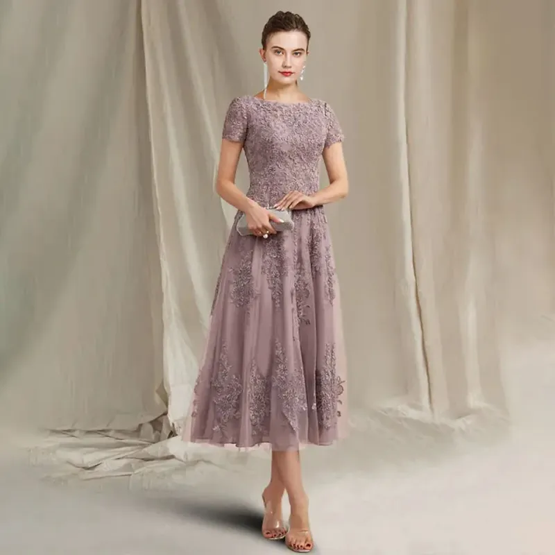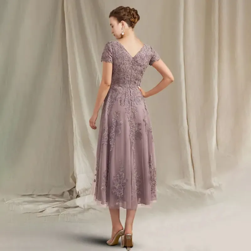 Custom Made Mother of the Bride Dress Elegant Chiffon Lace Short Sleeve Appliques Tea Length Guest Party Gowns Robe De Soiree