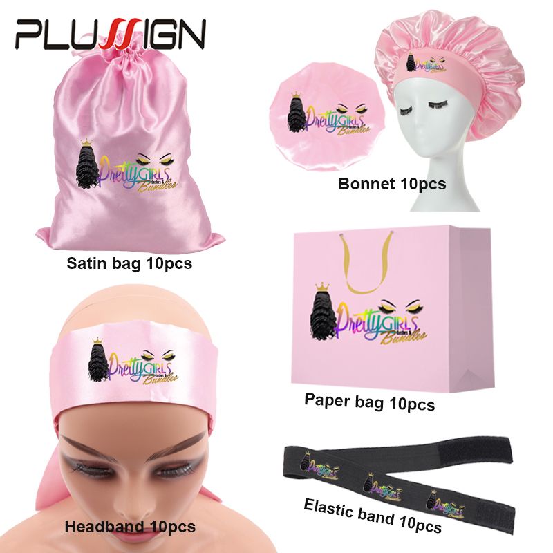 Customize 50Pcs Lace Band Paper Bag Satin Wig Bags For Hair Extension Packaging Satin Wig Cap For Curly Hair Edges Scarf Wrap