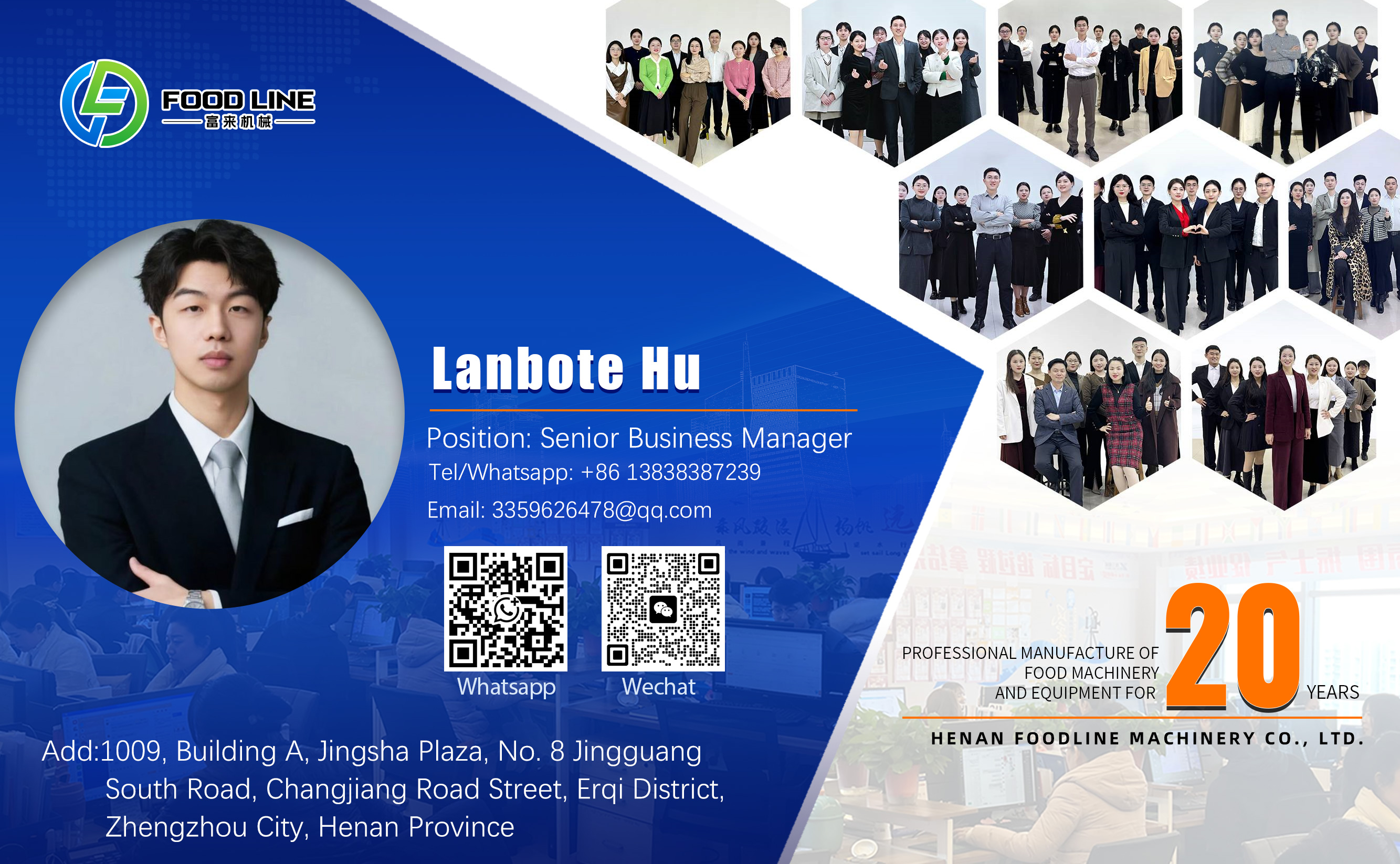 Henan Food Line Machinery Equipment Co., Ltd. located in China's national central city--Zhengzhou, with abundant resources and convenient transportation. Our company is a integrated large-scale manufacturing enterprise. Our company experienced 20 years of high-speed development, gathering large number of talents and winning sound reputation and credibility. Our product quality, rapid and healthy development ensured by convenient transportation network, advanced management concepts, and comprehensive management system. Henan Food Line Machinery Co., Ltd.: Take the reforming as the motive force, science and technology oriented, culture as the soul, continuously strengthen and improve enterprise management toward scientization, informatization, modernization. We sincerely expect to cooperate with various circles, achieve mutual benefit and win-win situation.
