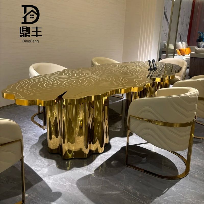 Customized Italian light luxury irregular-shaped dining table stainless steel etched and gold-plated countertop table and chair