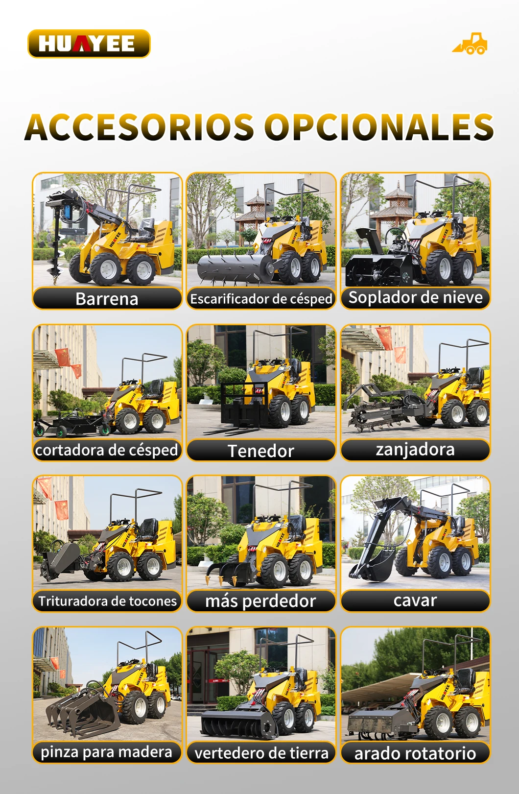 1. Optional accessories for mini skid-steer loaders include: breakers, augers, rakes, quick hitches, ripper, log grabbers, buckets of various sizes, and more.