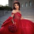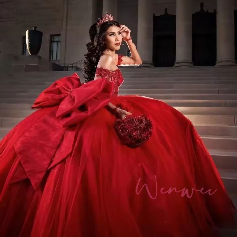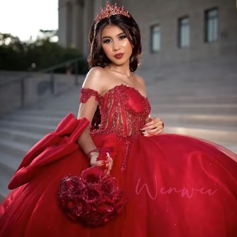 Customized Red Quinceanera Dresses Mexican Beaded Corset Princess Off Shoulder Party Dress With Big Bow vestidos de 15