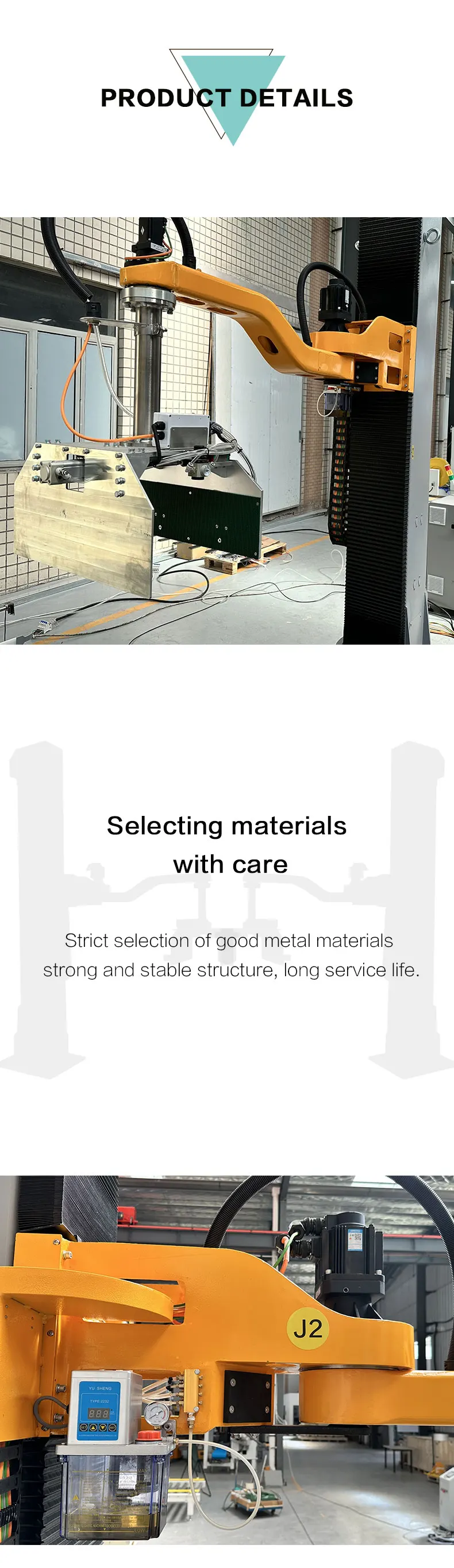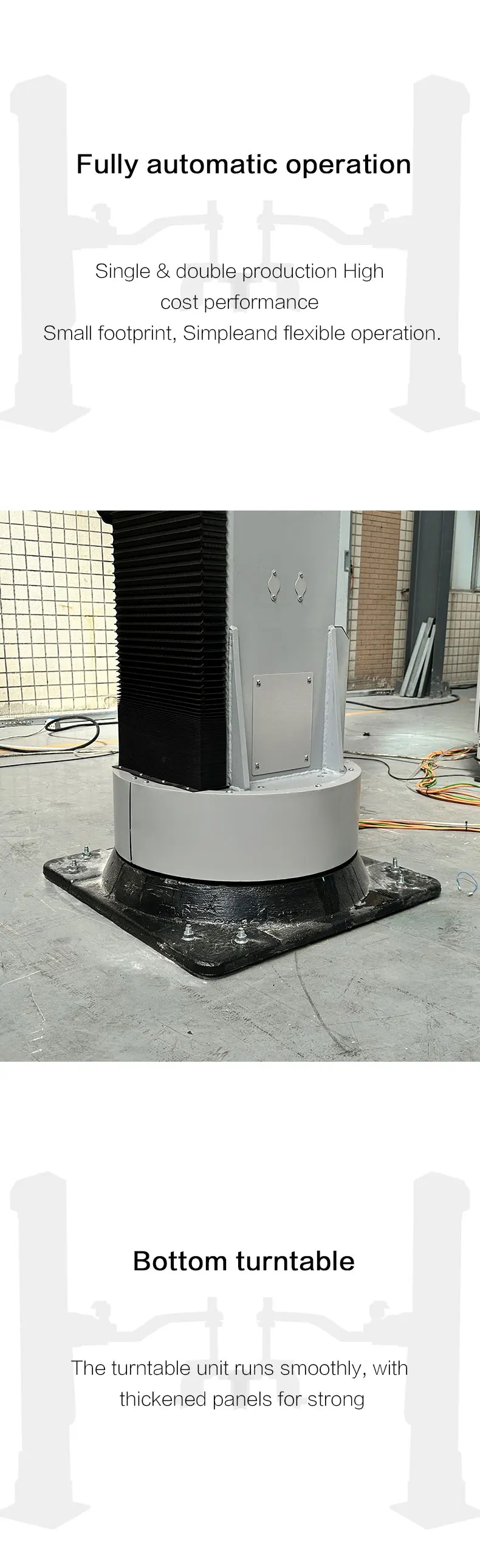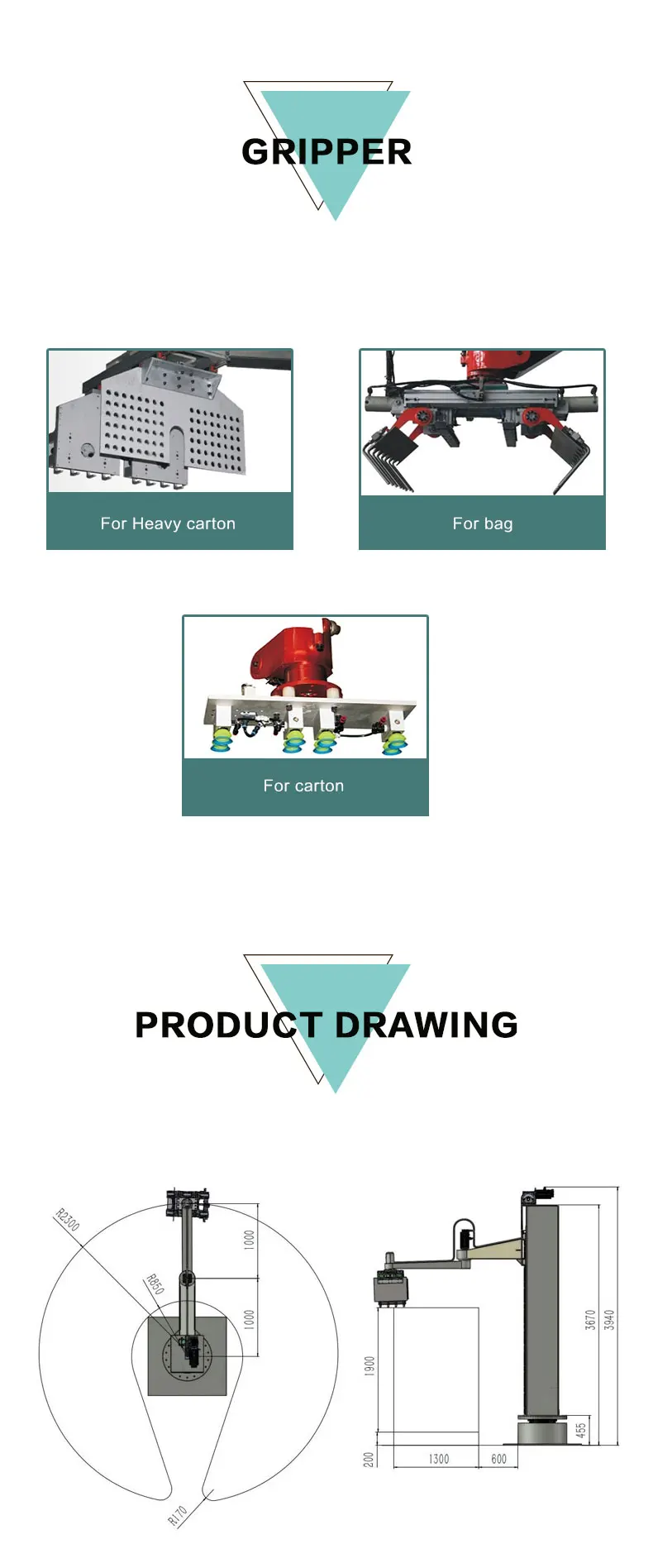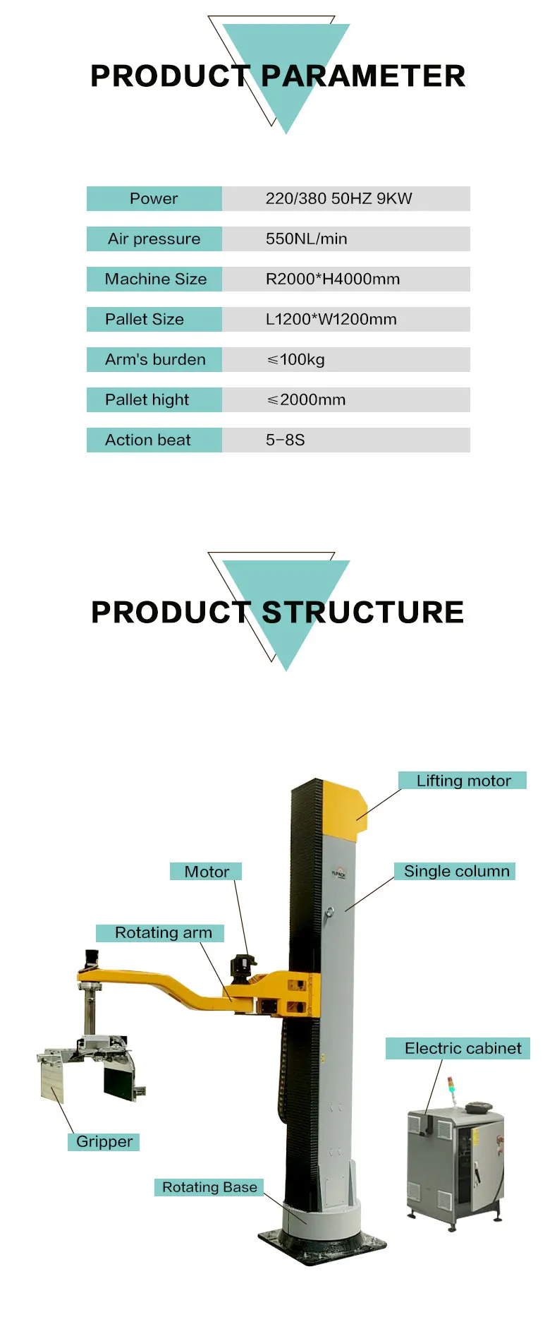 Single column armrobot palletizer is mainly used in beer, beverage, medicine and other industries production line end palletizing, with more than 180 degrees of rotation function, can be applied to multiple pallets palletizin at the same time, flexible rotation, small area, there are many dimensions, performance can be compared to robot palletizing. Adopt foreign advanced rotary column palletizing robot, the appearance is exquisile and beautiful. The adjustment of stacking method is convenient and simple, which can be caried out on the machine interface, and can also be contrilled by wired remoe control which is easy to operate and lean.