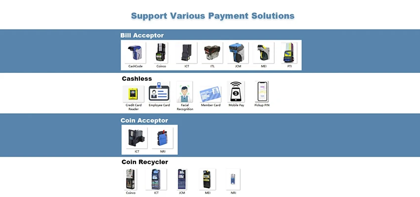 Banknote, coin, credit card, debit card, prepaid card, membership card, employee card, mobile pay, NFC, QR code and etc.