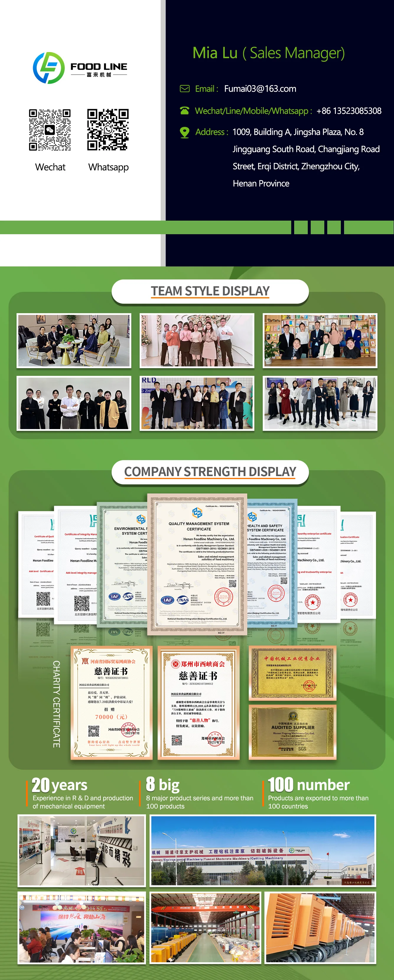 Henan Food Line Machinery Equipment Co., Ltd. located in China's national central city--Zhengzhou, with abundant resources and convenient transportation. Our company is a integrated large-scale manufacturing enterprise. Our company experienced 20 years of high-speed development, gathering large number of talents and winning sound reputation and credibility. Our product quality, rapid and healthy development ensured by convenient transportation network, advanced management concepts, and comprehensive management system. Henan Food Line Machinery Co., Ltd.: Take the reforming as the motive force, science and technology oriented, culture as the soul, continuously strengthen and improve enterprise management toward scientization, informatization, modernization. We sincerely expect to cooperate with various circles, achieve mutual benefit and win-win situation.