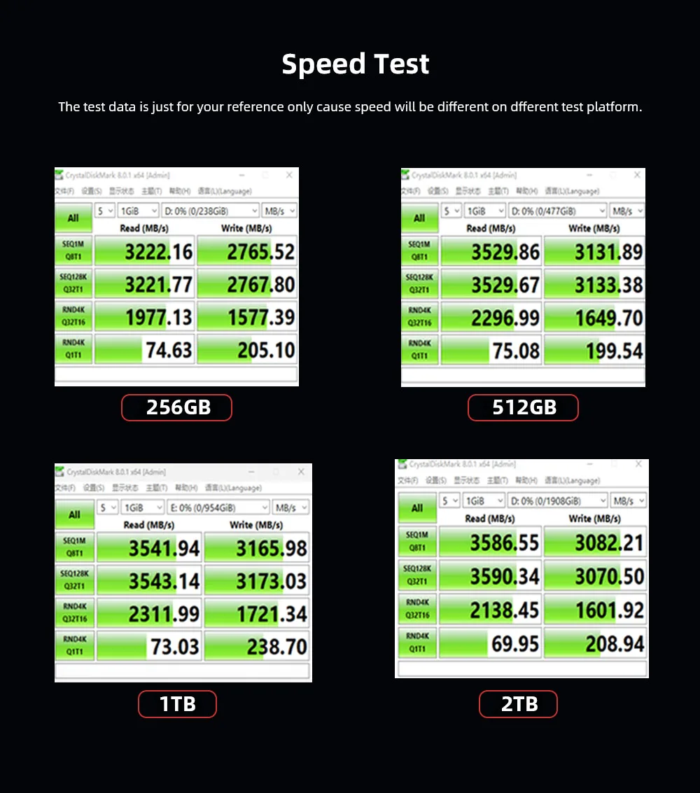 The speed is just for your reference, SSD speed will be influenced by many factors, such as  interface type, computer hardware grade, computer system, and test system.