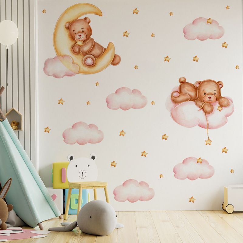 Cute Bear Moon Star Wall Stickers for Kids Rooms Girls Boys Baby Room Decoration Kawaii Cartoon Animal Nursery Wallpaper Vinyl