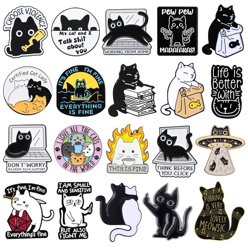 Cute Black White Cats Enamel Pins Cartoon Naughty Kitty Claw Animal Brooches Lapel Badge Fashion Jewelry Gifts For Kids Friends