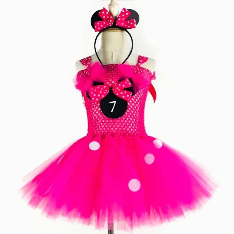 Cute Girls Pink Mickey Tutu Dress Baby Crochet Tulle Dress with White Dots and Hairbow Kids Birthday Party Cartoon Cosplay Dress