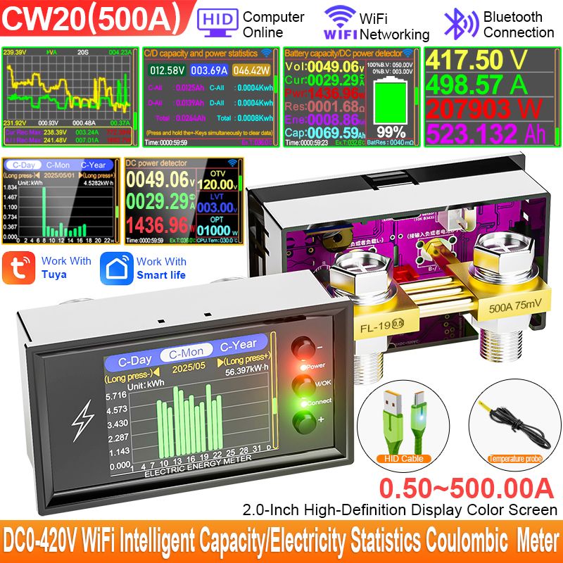 CW20 DC0-420V WiFi Tuya Smart Digital Lithium Battery Capacity Detection Tester DC Display Voltage Current Power Coulomb Meter