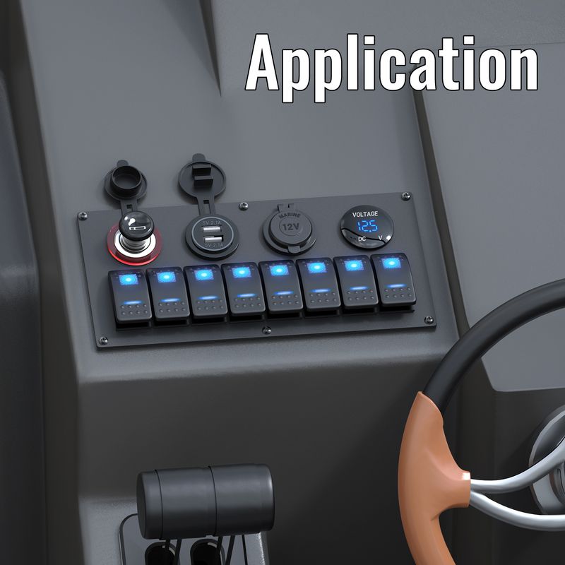 Dual USB Port SocketThe marine rocker switch panel contains two 5V 2.1A USB port sockets, supporting dual outputs that are 5V 2.1A to charge two devices at the same time. | Digital VoltmeterThe voltmeter on the waterproof control panel can monitor the power supply to prevent accidents caused by battery problems. | Pre-wired DesignPre-wired all-in-one design, each gang with 20A rating,makes connecting this panel much more convenient and easy for you. | StickerThis boat switch panel will come with a piece of sticker for you to DIY the switch. |