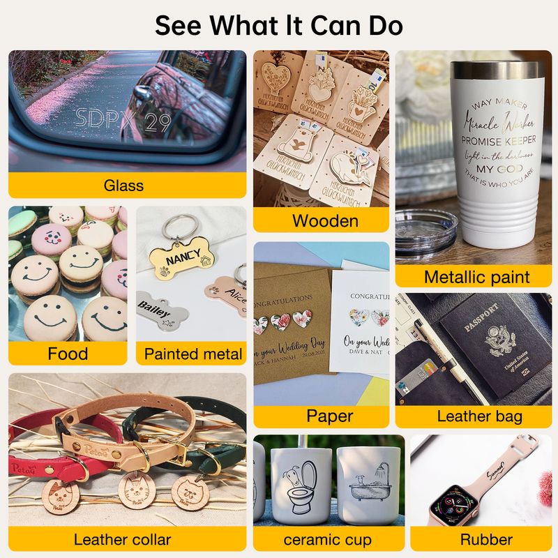 The DJ6 model can engrave: wood, paper, plastic, leather, bamboo, kraft paper, painted metal, and more