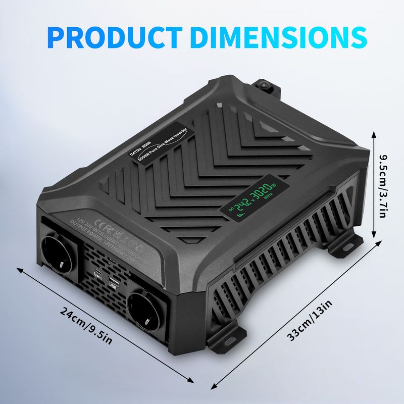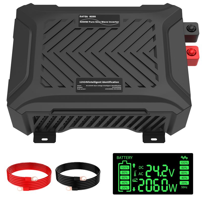 Thank you for your support of DATOUBOSS inverter, this product model is TY-PSW-6000, intelligent recognition of 12V and 24V battery, When operating in 12V mode, the rated power is 1500W and the peak power is 3000W. When operating in 24V mode, the rated power is 3000W and the peak power is 6000W. The working efficiency is ≥90%.