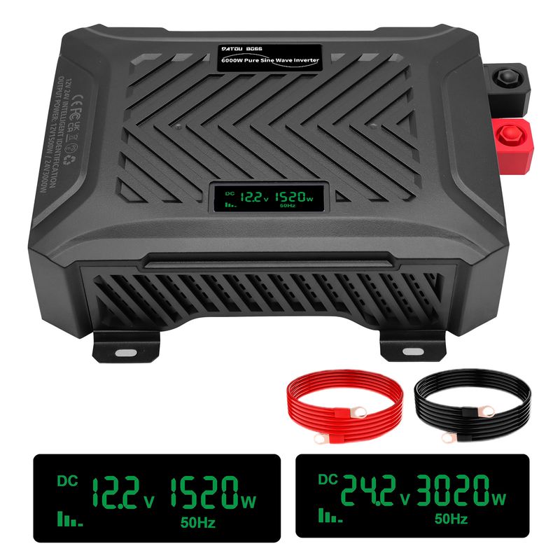 Thank you for your support of DATOUBOSS inverter, this product model is TY-PSW-6000, intelligent recognition of 12V and 24V battery, When operating in 12V mode, the rated power is 1500W and the peak power is 3000W. When operating in 24V mode, the rated power is 3000W and the peak power is 6000W. The working efficiency is ≥90%.