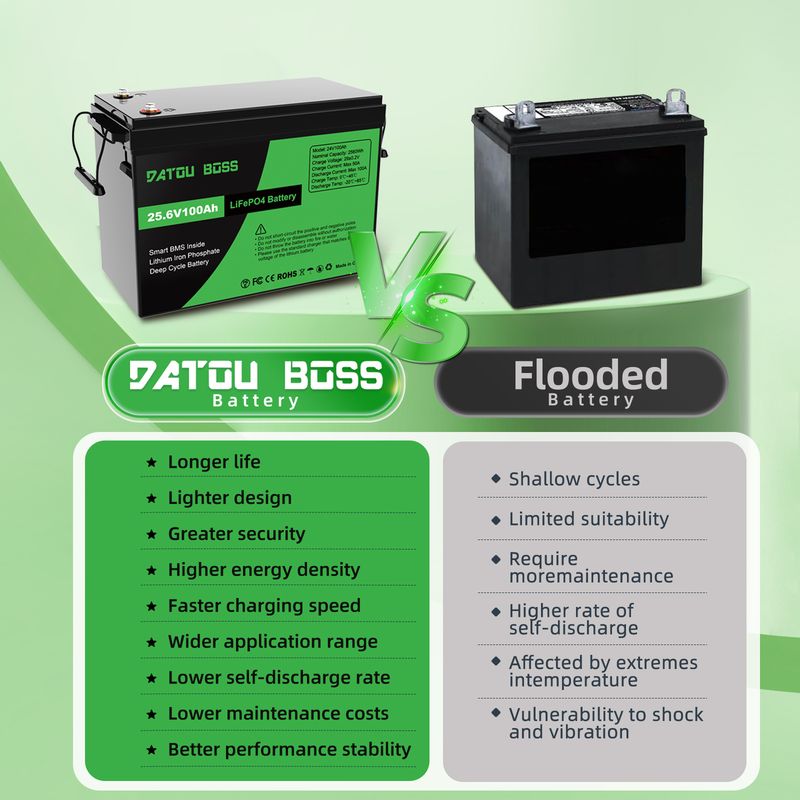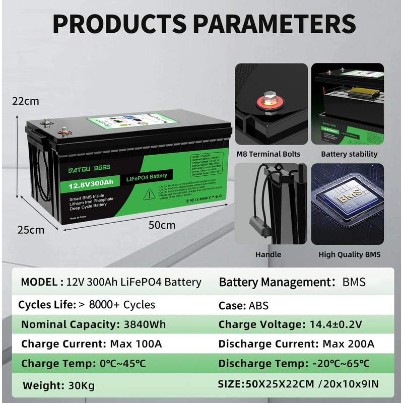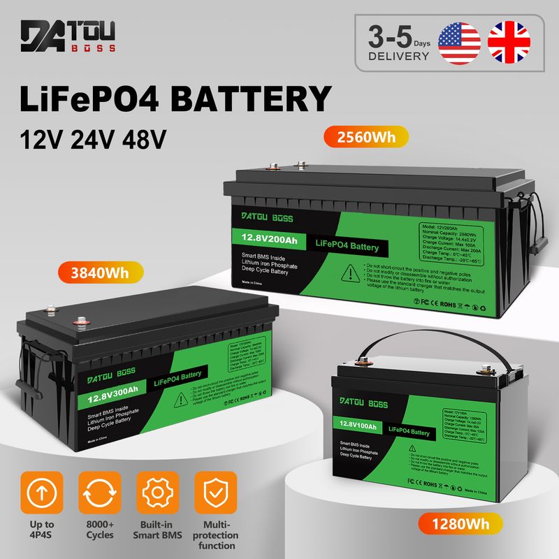 DATOUBOSS LiFePO4 Battery 12V24V48V 100Ah-300Ah 80A-100A Ultra-Fast Charge 200A Continuous Discharge Built-in BMS for Solar RV