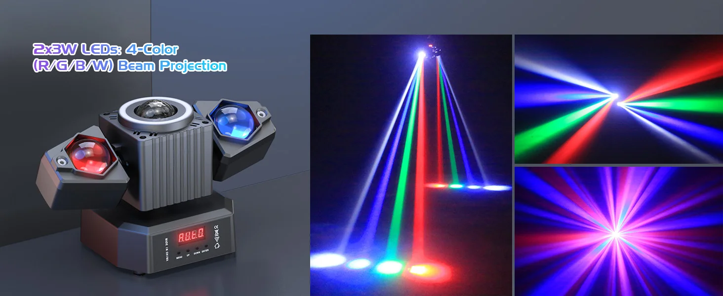 2.Flexible Projection and Rotation: The 2-arm RGBW beams can project four horizontal beams easily. With 180° rotation and 540° free rotation on the X-axis, it can produce gorgeous dancing lights.