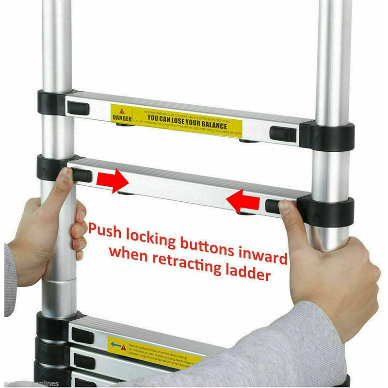 🔥【EXTENSION & RETRACTION DESIGN】The telescopic ladder can extend. Unique Extend and Locking Mechanism with Slide Latches, every section is designed to open and close safely. One hand holds upper pipe and the other hand pushes the slide latches of both side, then the ladder will slide down effortlessly. No matter what work you do, you can adjust the height of the ladder and lock it according to your needs.
