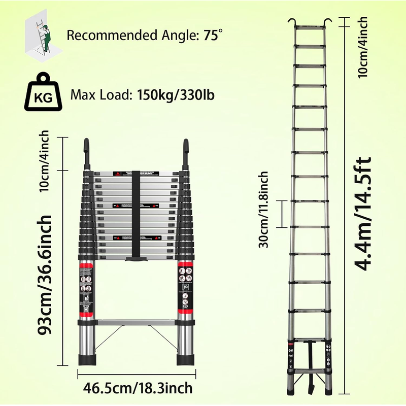 🔥【HIGH QUALITY】Compare with Aluminum Ladder, Our newest telescoping ladder is made of heavy duty Stainless Steel, which has much better load bearing, more sturdy and wear resistant, no need to worry about the ladder bending and wobbling, climb on it more safely. It can carry up to 150kg/330lb. Manufactured to the highest standard, this ladder conforms to EN131 Standards.