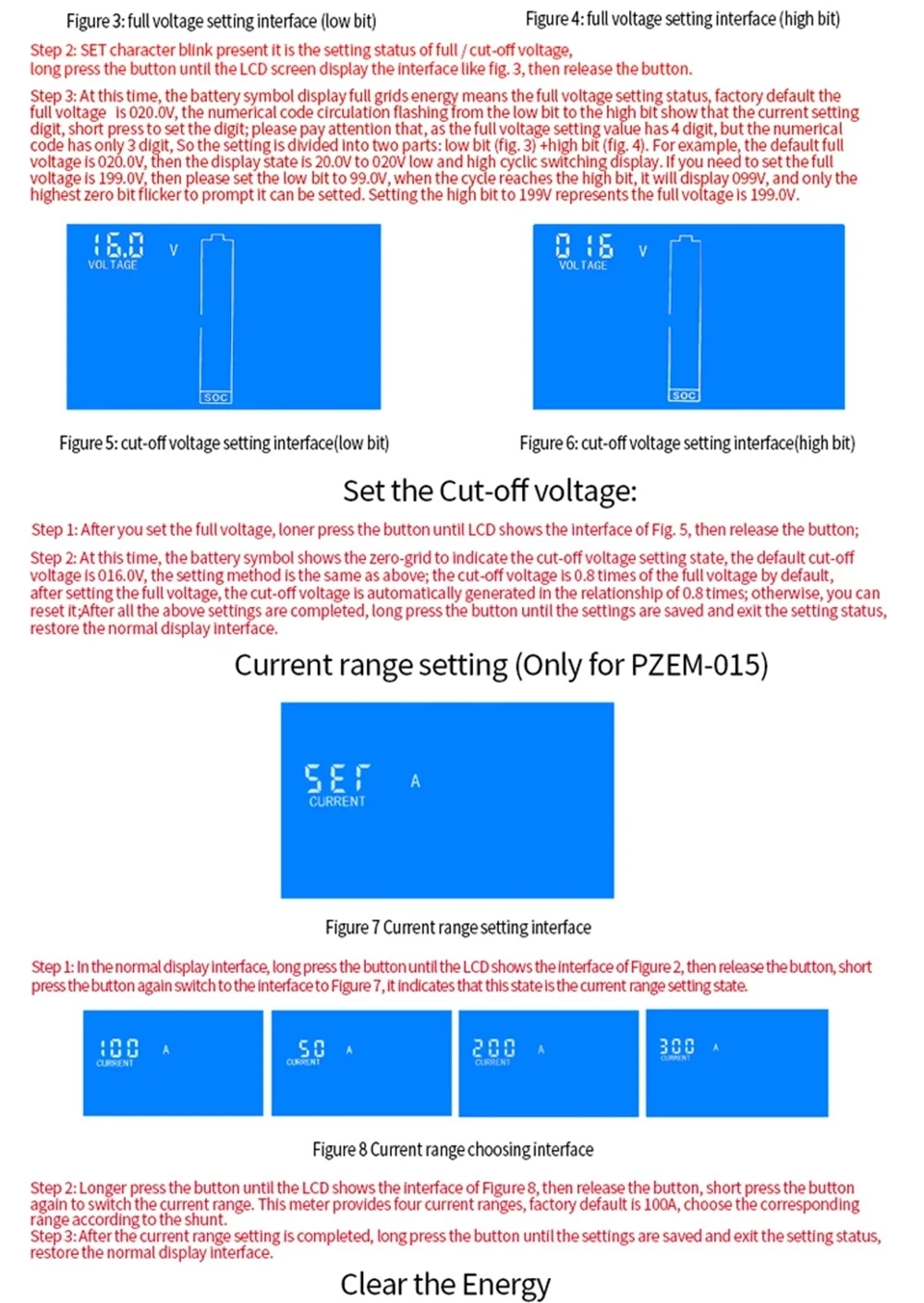 0-300A can set 50A, 100A, 200A,300A four range depend on the external shunt, the factory default is 100A.