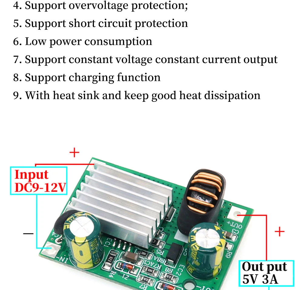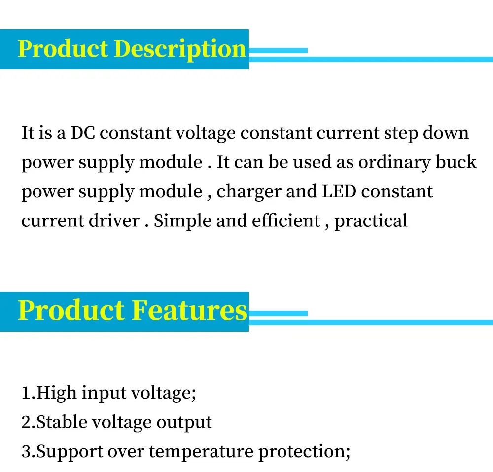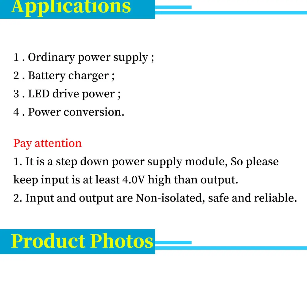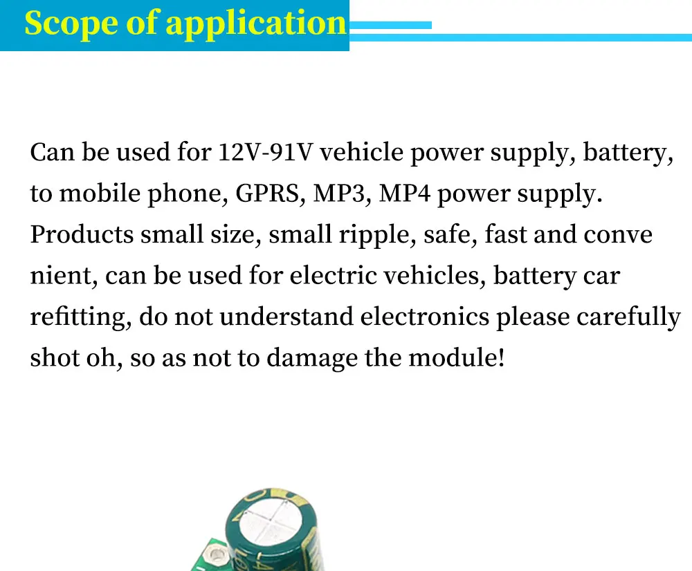 It can be used for 12v-90v vehicle power supply, battery, charging mobile phones, MP3, MP4, etc. The product is small in size, isolated from the power supply, with reverse connection protection, safe, fast and convenient, and can be used for electric vehicles, battery cars, etc. those who do not understand electronics should be careful to take photos, so as not to damage the module!