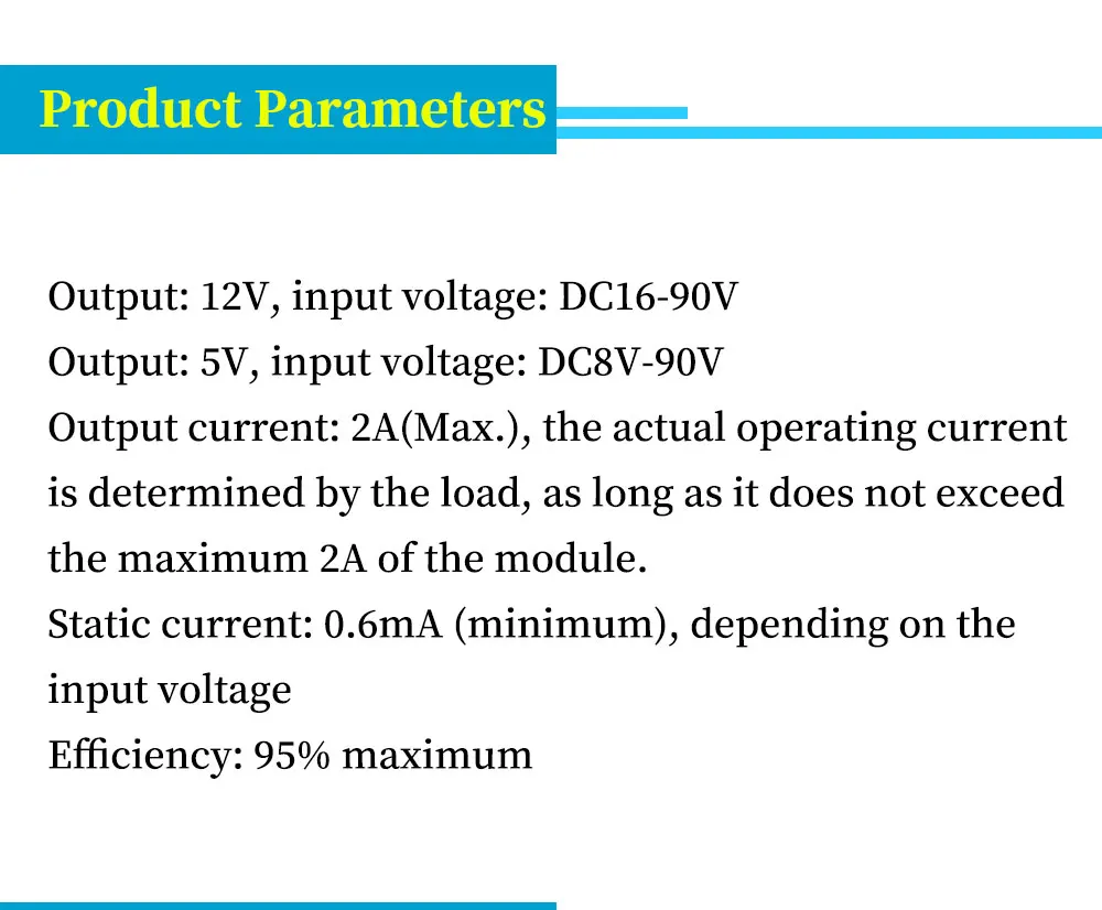 The minimum voltage difference between input voltage and output voltage is 4V (when the output is 5V, the input voltage is dc9-90v, and when the output is 12V, the input voltage is dc16-90v)