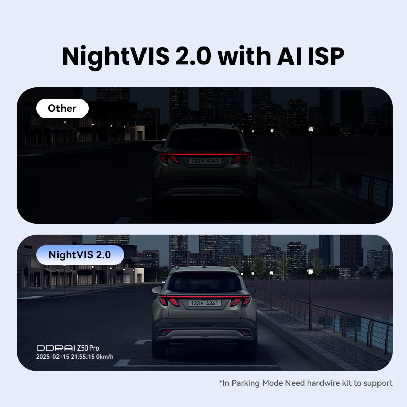 Powered by DDPAI's advanced NightVlS 2.0 technology and Al ISP image processing, the Z50 Pro enhances night vision for parking monitoring, delivering brighter and clearer footage even in the darkest environments.