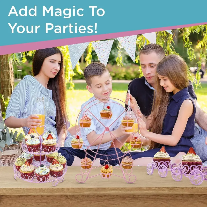 This ferris wheel cupcake rack is built sturdy and light weight Providing beautiful presentation as well as convenient transportation for your baked goods