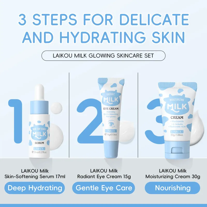 LAIKOU Milk Glowing Skin Care Trio Set Deep Hydrating Skin-Softening Serum Gentle Eye Care Radiant Eye Cream Long Lasting Nourishing Moisturizing Cream