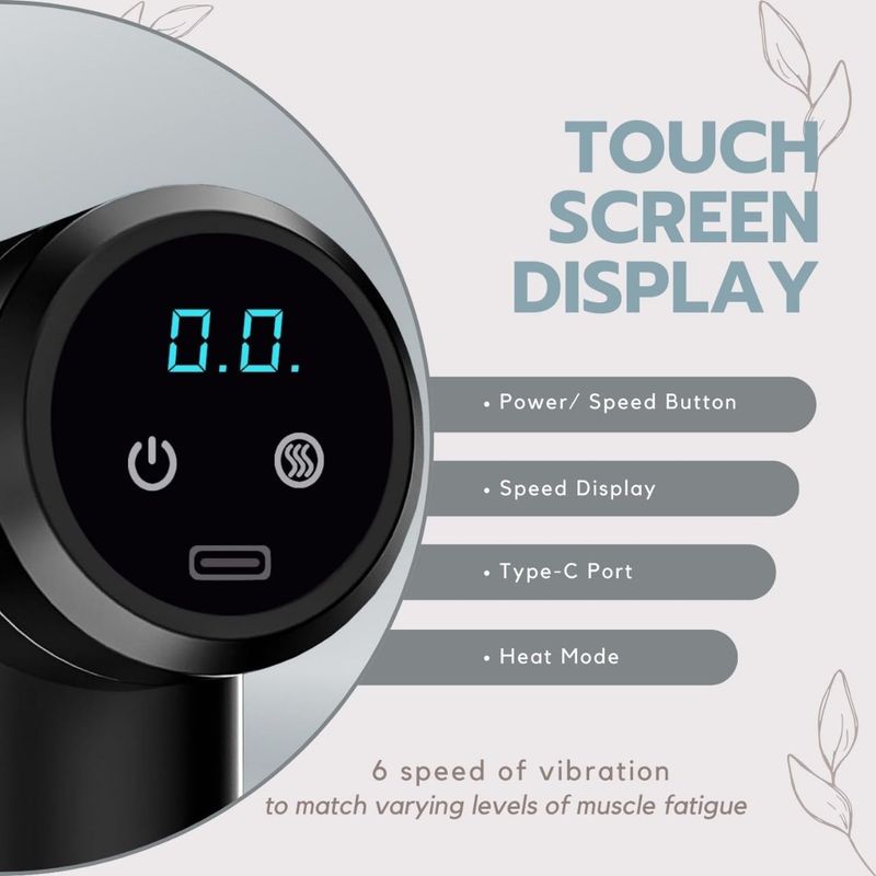 4.【Smart Touch Screen for Easy Control】With an intelligent LCD display, this massage gun allows you to easily adjust speed levels, monitor battery life, and track massage pressure. The user-friendly touch screen provides a modern, seamless control experience, making it simple to customize your muscle recovery.